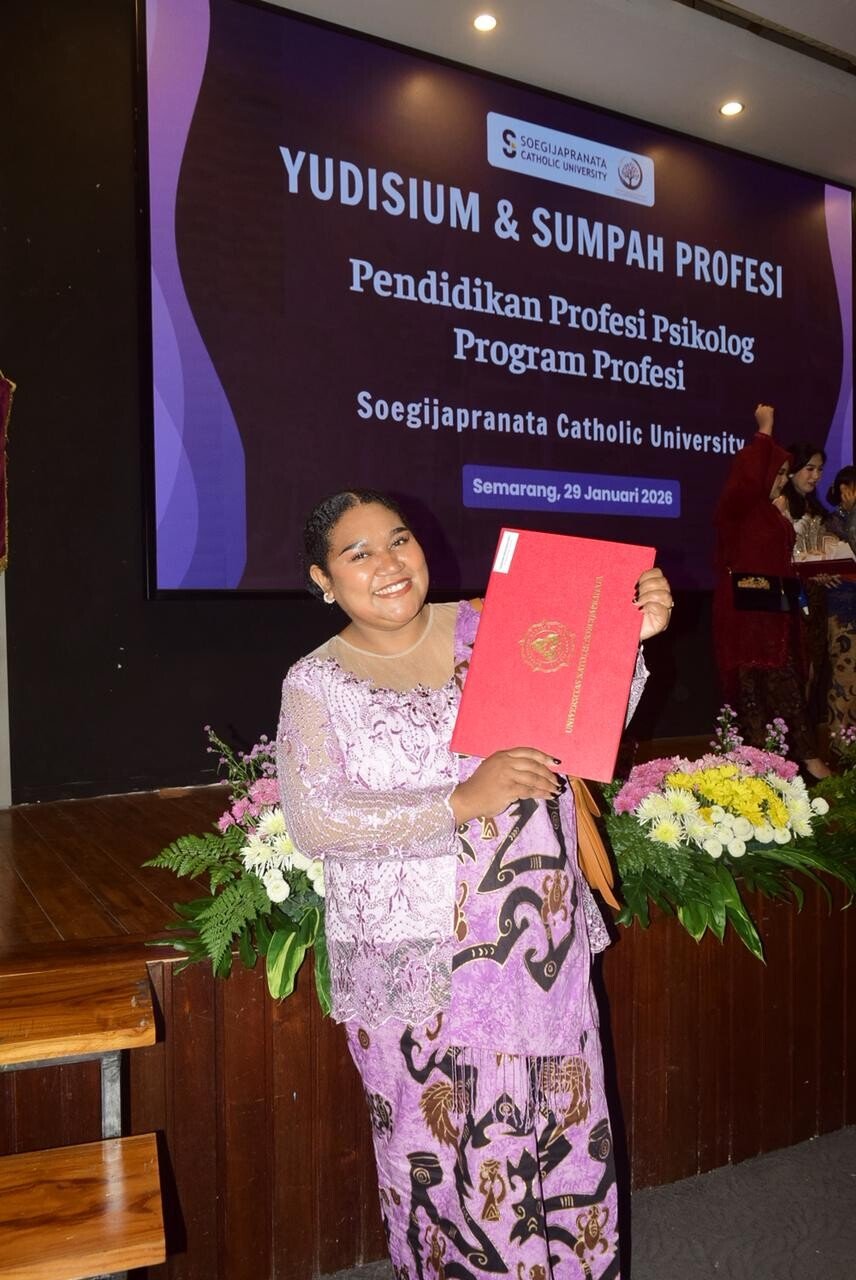 Faradiba Anugerah Kaay, Kamis (29/1) lulus Fakultas Psikologi Universitas Katolik Soegijapranata (Soegijapranata Catholic University/SCU) sekaligus disumpah sebagai Psikolog angkatan pertama di Kampus SCU, Jalan Pawiyatan Luhur, Bendan Dhuwur, Semarang, Jawa Tengah.