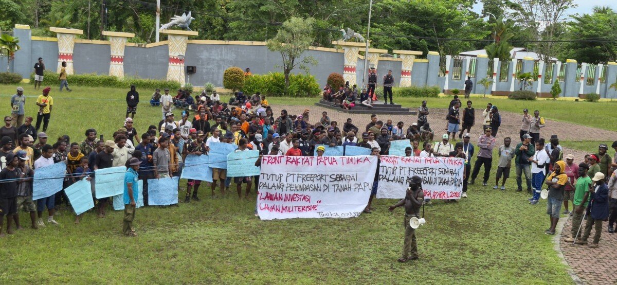 TIMIKA, Cartenznews.com – Massa aksi dari Front Rakyat Papua Lakukan aksi demo damai di kantor DPRK Mimika menuntut mengembalikan Otsus ke Pemerintah Pusat dan Penutupan PT Freeport Indonesia, Selasa (7/4/2026).