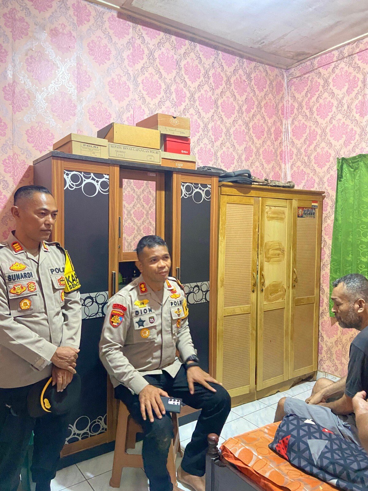 Kepala Kepolisian Resor Jayapura AKBP Dionisius Vox Dei Paron Helan, SIK, MH, M.Tr.Mil didampingi Kepala Kepolisian Sektor Sentani Kota AKP Sunardi S.Sos saat anggota Polsek Sentani Bripka Fence Trisnovel Pinoa yang sedang mengalami sakit menahun di kediamannya, Sentani, Jayapura, Papua, Senin (30/3). Foto: Istimewa